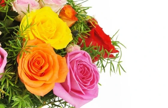 Détail des fleurs : roses multicolores (rouges, orange, rose et jaunes), roses gros boutons et branchage d’aspagarus (Réf : 4213 – Fragrance) – Visuel non contractuel – Visuel correspondant à la formule Meilleur Compromis