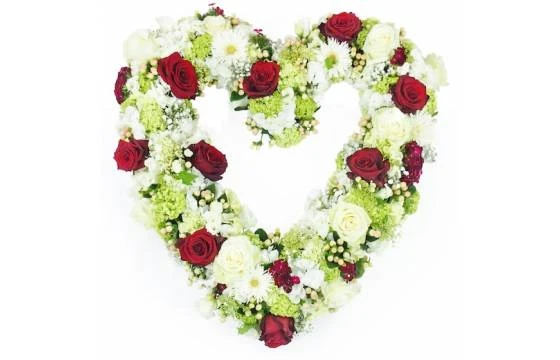 Détail de la création florale : Coeur de fleurs blanches et rouges pour un deuil. Cette création florale réalisée par un artisans fleuriste local est composée de rose, hortensia, oeillet, lisianthus, gypsophile, viorne (pompon vert ou blanc), germini (ou gerbera), hypéricum, fleurette et pointe de feuillage. Il mesure environ 60 cm de hauteur 63 cm de largeur (Formule « Meilleur compromis »)(Fleurs variables selon les saisons et la disponibilité en magasin tout en gardant l’esprit, la forme et les couleurs)(Ref Florale : 9356 – Achille). Visuel non contractuel – Visuel correspondant à la formule Meilleur Compromis – Non compatible avec une crémation.