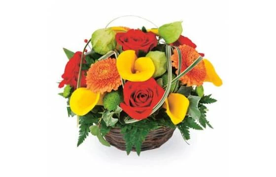 Maïa telle la femme de Zeus, est une magnifique composition de fleurs dans les tons jaune, orange et rouge qui est idéale comme cadeau à offrir. Composée de rose rouge, calla jaune, gerbera orange, et santini vert, elle inspire joie et soleil. Quelques feuillages y sont rajoutés à la base et sur le dessus pour apporter du volume et de la fraîcheur avec sa touche de verdure. Les feuillages de cet assemblage de fleurs sont le physalis, la fougère et feuille de pandanus. Le tout est piqué dans un panier en osier sur de la mousse florale.