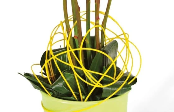 Ces splendides roses jaunes sont belles comme le soleil, elles scintillent et mettent en valeur cette très jolie composition. Un fuseau de 5 roses effeuillées est présenté dans un joli pot en céramique dans les tons vert anis. Le feuillage est travaillé à la base avec du rattan flat (ou sisal) pour apporter du mouvement à la création florale (le contenant peut changer selon la disponibilité en boutique, mais il sera toujours choisi par notre artisan fleuriste dans le respect de l’harmonie des couleurs et des fleurs).