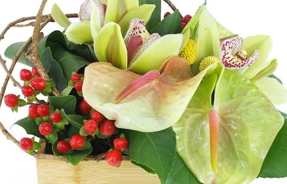 Détail de la composition: Composition carrée de fleurs piquées de couleur verte, avec une pointe de rouge et de jaune. Cette création florale réalisée par un artisan fleuriste local est composée de cymbidium, anthurium, baie, fleurette, feuillage et décoration naturel en bois. Le tout piqué dans un contenant carré en bois. (Fleurs et contenant zinc ou céramique variables selon les saisons et la disponibilité en magasin tout en gardant l’esprit, la forme et les couleurs). (Ref Florale : 2305 – Aurora). Visuel non contractuel – Visuel correspondant à la formule Meilleur Compromis.
