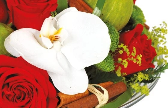 Cette subtile composition florale de roses dans les tons rouge, vert et blanc est surnommée Perle de Rose. Assemblée dans un contenant en verre transparent, elle se constitue de roses rouges, d’orchidées blanches et de fleurs de pavots. Notre artisan fleuriste qui a créé cette composition, a rajouté des feuilles de pandanus, du pittosporum et du feuillage style fleurs d’anis. Le fleuriste a également rajouté une petite touche personnelle décorative haut en épice avec quelques fagots de cannelles.