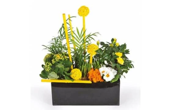 Vous ne voulez pas faire livrer un bouquet ou une composition de fleurs, mais plutôt une plante pour que l’heureux destinataire puisse en profiter longtemps ? Vous êtes au bon endroit. Découvrez Le jardin d’Abel, non pas le jardin du deuxième fils d’Adam et Eve, mais une magnifique coupe de plantes jaunes imaginées par l’un de nos artisans fleuristes partenaire du nom d’Abel. Dans les tons jaunes, cette éblouissante coupe se compose d’une grande variété de plantes qui pourront être replantées en terre pour être gardé en intérieur ou en extérieur. Le Jardin d’Abel comprend un mini rosier jaune, un kalanchoé aux petites fleurs jaunes, une primevère blanche, de bulbes de jonquilles et à la base de deux petits kentias. Pour soutenir la couleur dominante jaune de cette coupe de plante, notre fleuriste Abel a rajouté des décorations faites avec des bois teintés jaunes et des boules d’osier peintes de la même couleur. L’ensemble floral est ensuite présenté dans un contenant rectangulaire en bois peint en noir que certains fleuristes adapteront avec une cagette en bois customisée ou tout autre contenant de couleur noire en fonction de leur disponibilité en magasin.