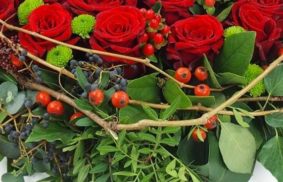 Détail du coussin : Coussin de fleurs piquées pour enterrement dans les tons rouges et vert. Cette création florale est composée de rose rouge, baie de saison et feuillage flou de saison à la base. Une décoration naturelle est apportée avec du branchage qui entoure l’ensemble. (Ref Florale : 9323 – Eros). Visuel non contractuel – Visuel correspondant à la formule Meilleur Compromis – Non compatible avec une crémation.