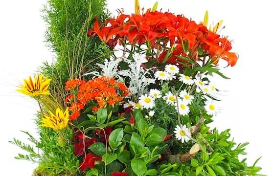 Détail de l’assemblage : Grande coupe de plantes vertes et fleuries dans les tons chauds. Cette création réalisée par un artisans fleuriste local est composée d’un lys, conifère, kalanchoé, anthémis, dipladénia et diverse plante verte. De la mousse est ajoutée à la base des plantes et des branches de bois sont déposées pour une décoration naturelle. Le tout assemblé dans un contenant. (Fleurs variables selon les saisons et la disponibilité en magasin tout en gardant l’esprit, la forme et les couleurs)(Ref Florale : 9368 – Solis). Visuel non contractuel – Visuel correspondant à la formule Meilleur Compromis – Non compatible avec une crémation.
