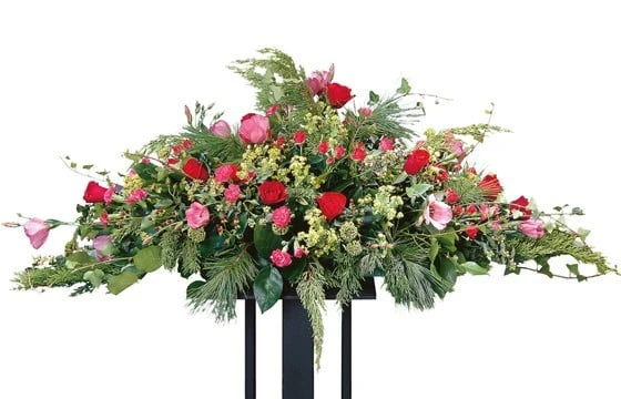 Vous venez de perdre un être cher et vous souhaitez lui rendre un dernier hommage avec la livraison d’une raquette de fleurs pour son deuil ? L’Agitateur Floral vous accompagne dans ces moments difficiles et vous propose une grande variété de raquettes de deuil aussi appelé dessus de cercueil avec ici Crépuscule. De forme légèrement conique et au style champêtre, cette raquette se compose de magnifiques roses de couleur rouge, de minis œillets aux pétales roses et de splendide lysianthus rose. Indispensable à toute création florale, du feuillage de différents conifères accompagne l’ensemble où du lierre sera mis en avant afin de marquer ses traits et un brin d’originalité.